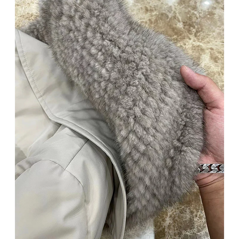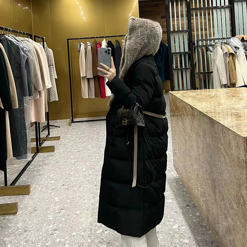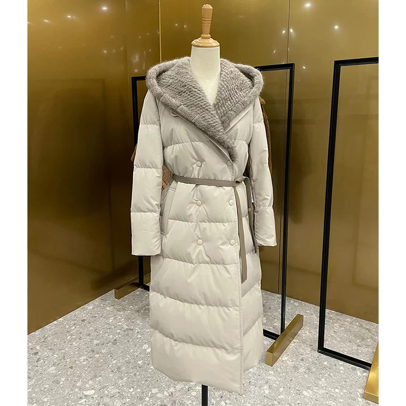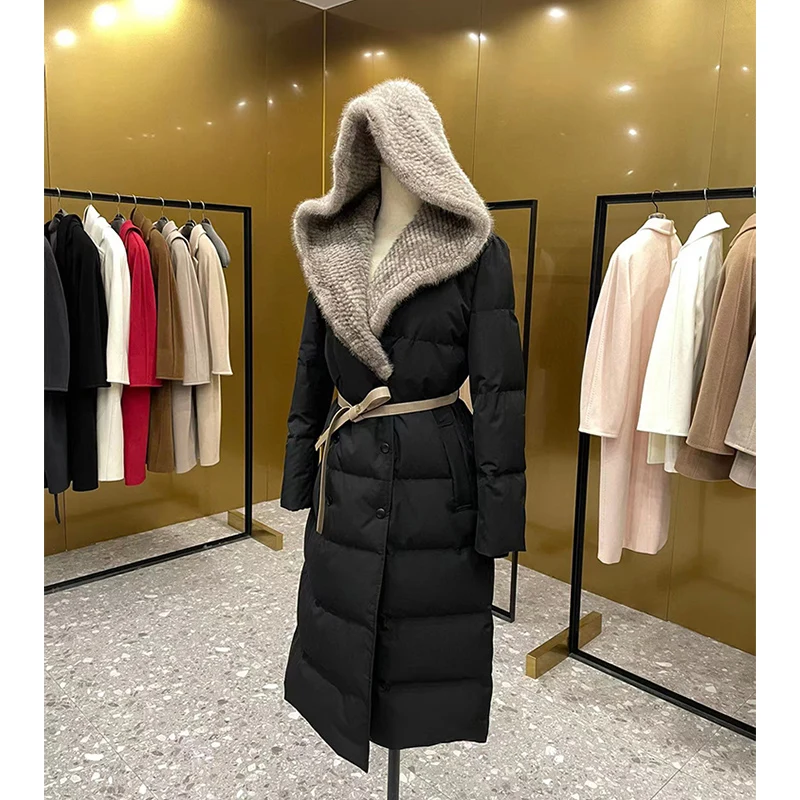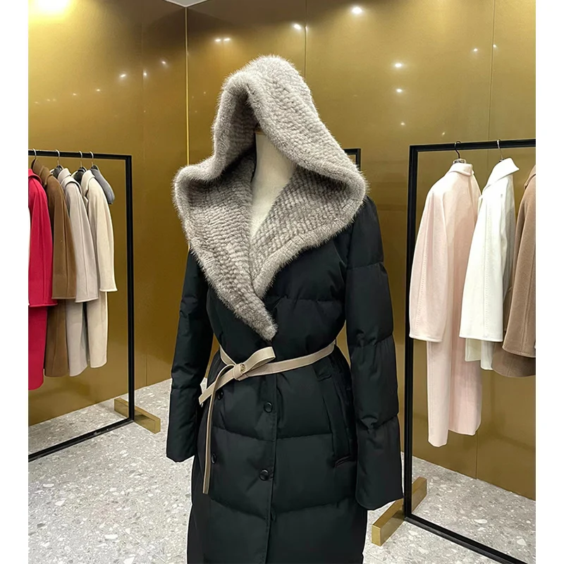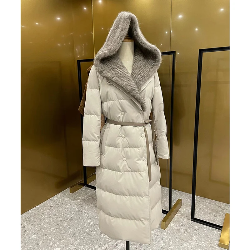 2023 Winter Women Long Coats Filling White Goose Down With Natural Real Mink Fur Collar Luxury Thick Warm Hooded Fashion Jacket
